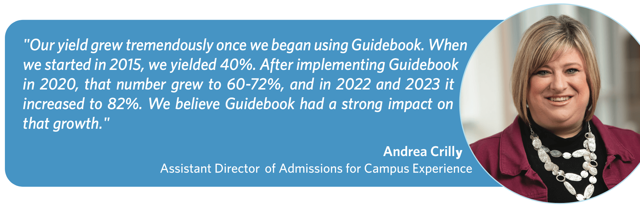 - 105% yield increase: Student yield from Admitted Students Day attendees rose from 40% to 82%.