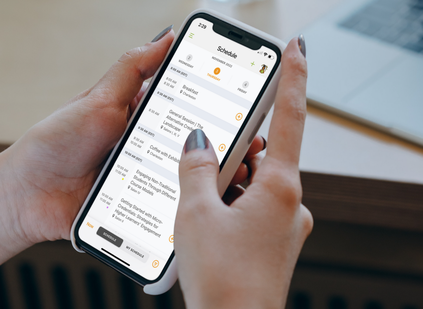 - Personalized SchedulesAttendees enjoyed the autonomy to build their own schedules, ensuring they could make the most of their time at the conference. “The ability to make admin changes through the app on a mobile device is one of the UPCEA team’s favorite features,” noted the team.