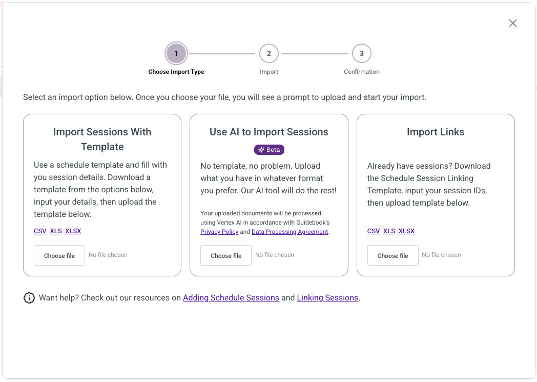 - Use AI to Import Sessions: upload your event schedule file in whatever format you already have it, and our AI handles the rest.