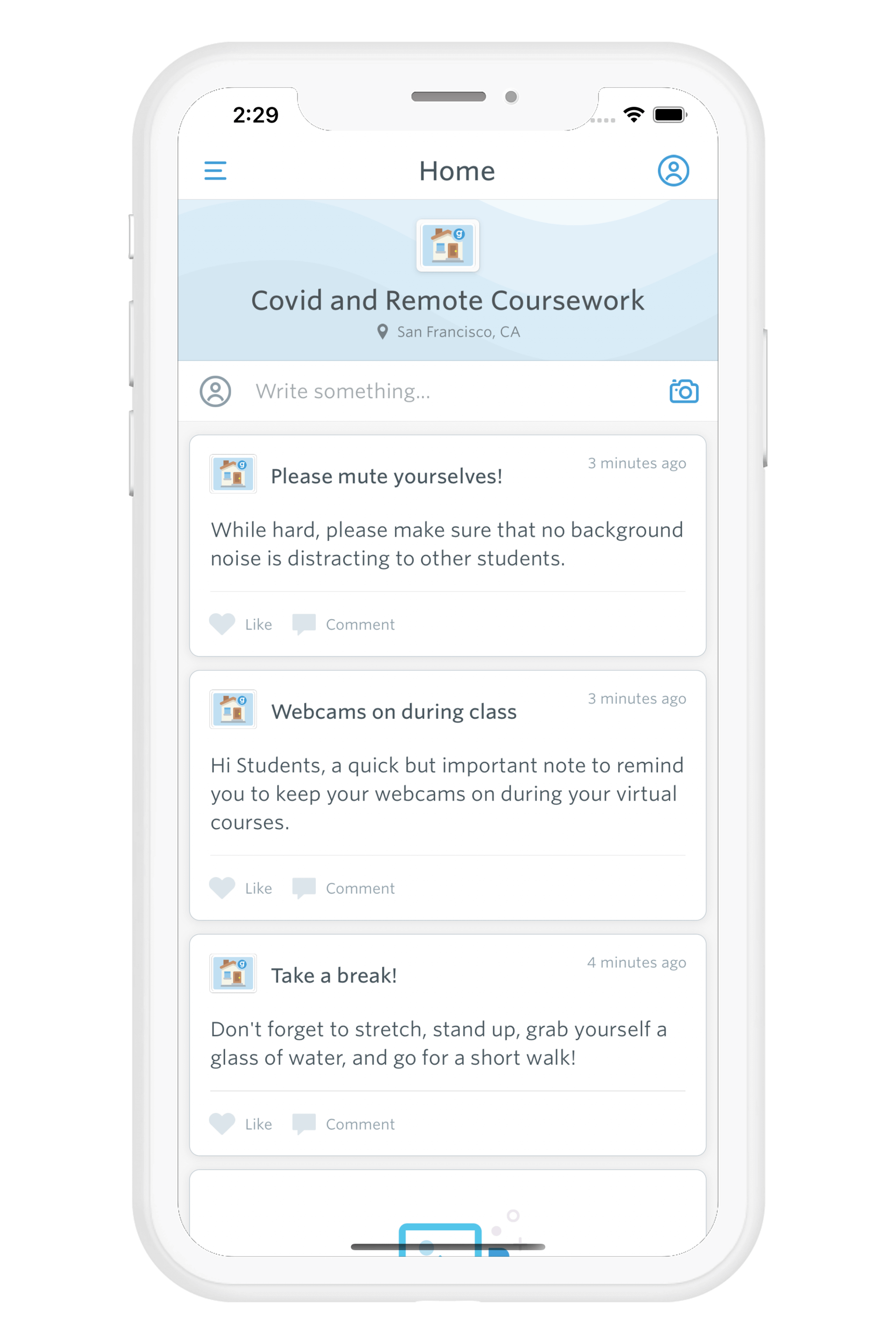 This is a live social feed. We also set it as the home screen of the guide because it's kind of the life blood of the app. Here you could share updates regarding COVID-19, health and wellness tips, or share software advice for students who are now working remote.Be Safe! (feature name: Custom List)