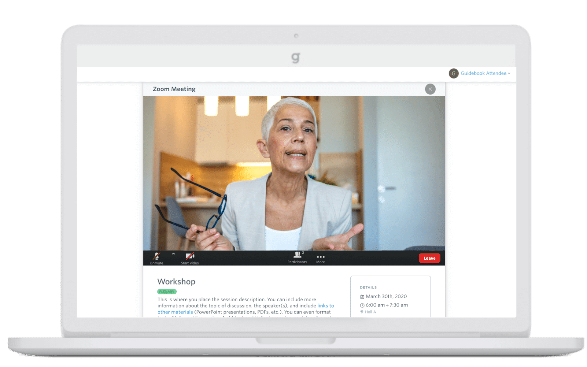Our enhanced integration with Zoom simplifies virtual event streaming. Simply drop a Zoom link into your Guidebook session, and your attendees will have direct access to your meeting or webinar. The Zoom experience on Guidebook enables live streaming directly from your Guidebook Web page.