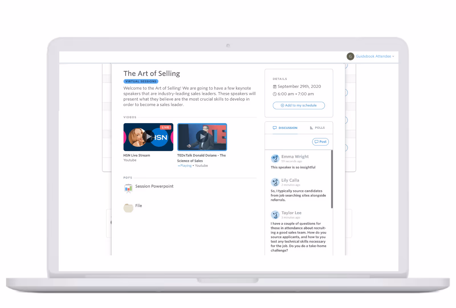 Pairing Guidebook with top video platforms provides your audience with an engaging virtual environment. Create an engaging environment where attendees can engage with each other while tuning into your content.Interact - Event-wide discussion feed